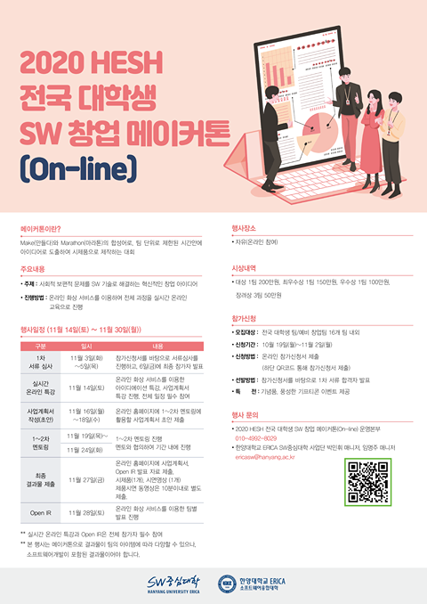 2020 HESH 전국_대학생_SW창업_메이커톤(On-Line) 안내 일정: 11.14(토)~11.30(월) 세부내용 첨부 파일 참조