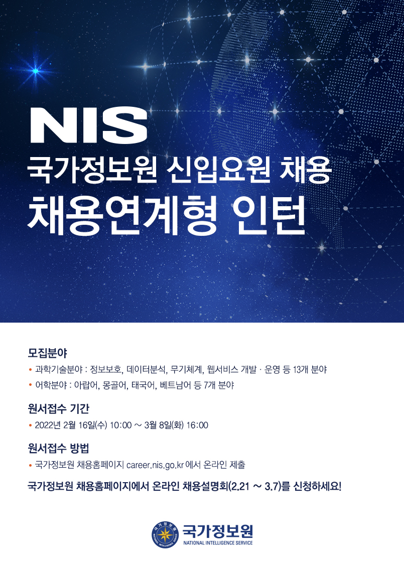| 제목 | [채용] 국가정보원 2022년도 채용연계형 인턴 모집 | 날짜 | 2022-02-28 | 조회수 | 1066 |