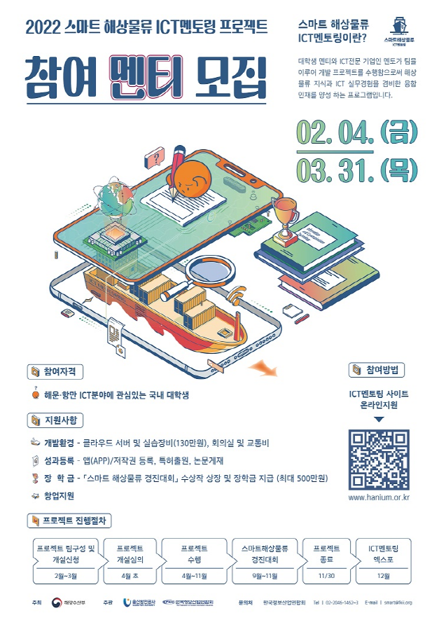● 사업명 : 스마트 해상물류 x ICT멘토링 ● 사업개요 : 산업현장 실무형 프로젝트를 통하여 ICT와 해상물류 분야 융합인재 양성 ● 모집개요 - 참여자격 : 국내 대학교 재학생 누구나 (휴학생, 수료생 가능) ● 지원사항 : 팀 지원비 130만원, 오프라인 팀미팅(회의실 및 교통비), 성과등록(특허출원, 논문게재, 앱등록, 프로그램 저작권), 창업연계 등 ● 참여방법 : ICT멘토링 사이트(hanium.or.kr) 회원가입 후 '스마트해상물류' 프로젝트 공고 및 참여 신청 ● 문의 : 한국정보산업연합회 스마트해상물류사무국 (tel: 02-2046-1462~3, e-mail: smart@fkii.org)