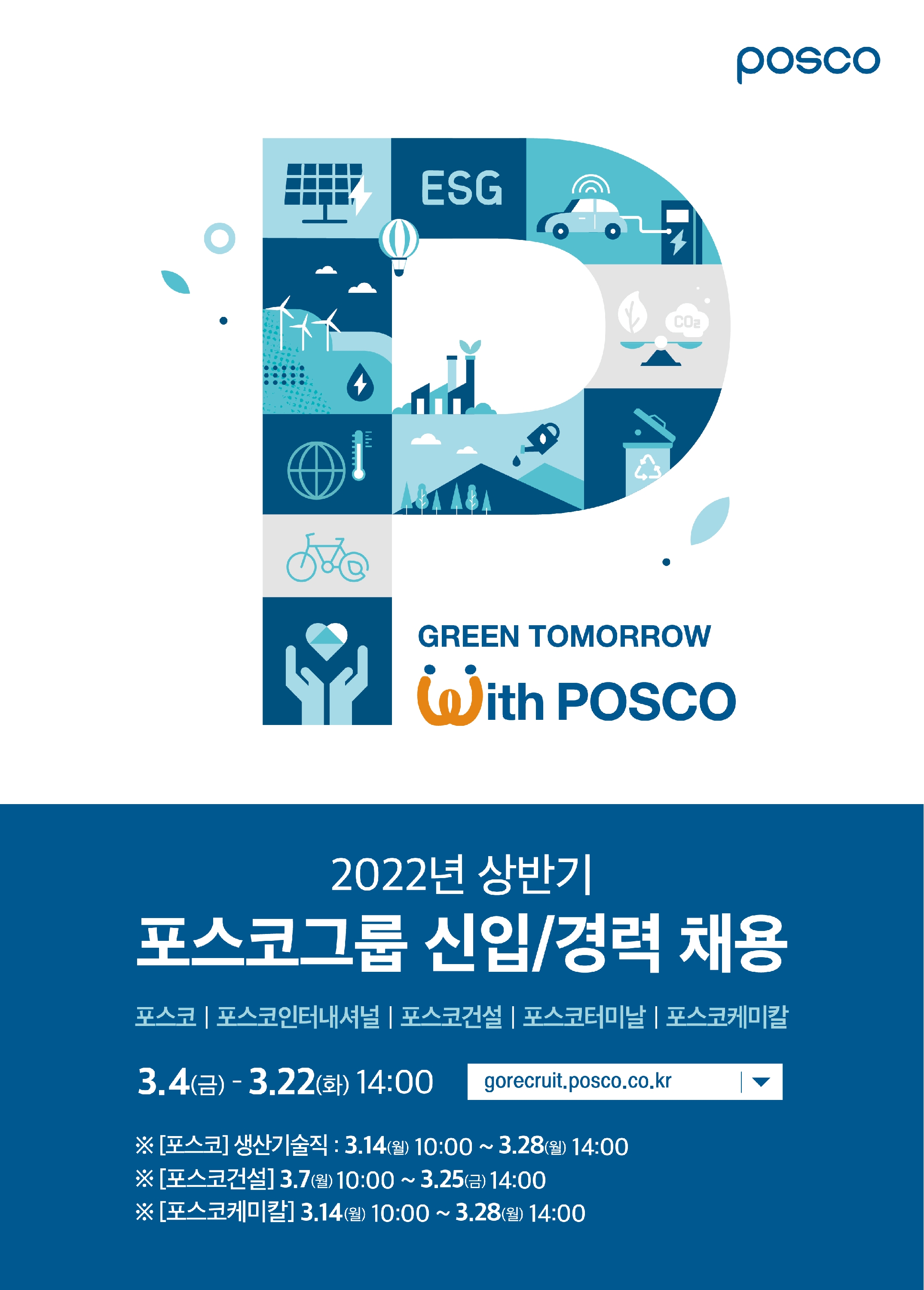 22년 상반기 포스코 신입사원 채용모집이 곧 마감합니다. 공고 확인하여 주시고, 많은 지원 바랍니다. (~3.22(화) 14시 마감)