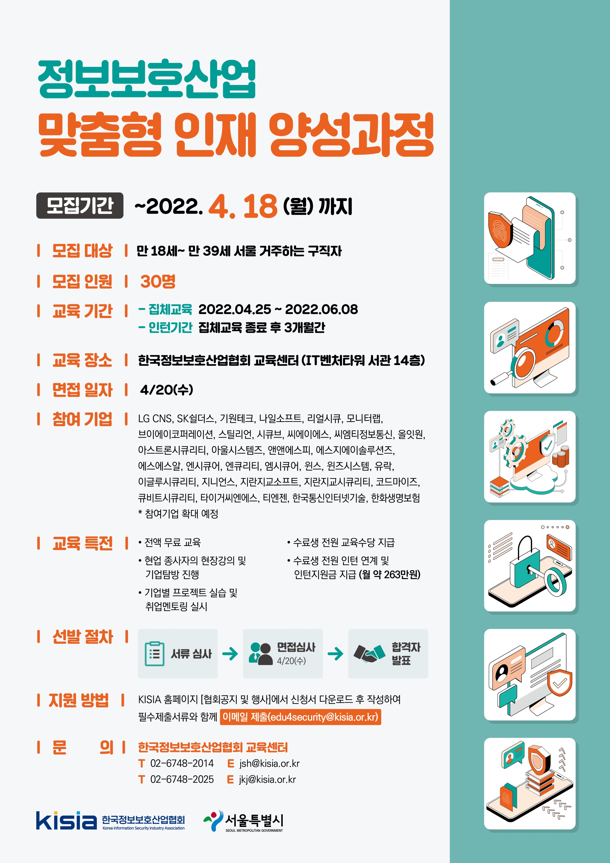 < 정보보호산업 맞춤형 인재 양성 과정 > o 집체교육 : 2022. 4. 25 ~ 2022. 6. 8 (주 5일, 일 8시간) o 인턴기간 : 집체교육 후 3개월 o 교육인원 : 30명 o 교육장소 : 한국정보보호산업협회 교육센터 (IT벤처타워 서관 14층) o 교육특전 : 전액 무료 교육, 수료생 전원 인턴연계(약 263만원*3개월 지원), 수료생 전원 교육수당(일2만원) 지급 등 o 공고기간 : 2022. 4.9 (토) ~ 4.18 (월)까지 * 공고기간 전 자격요건을 충족하고 배제사유가 없어야함 o 신청서류 : 첨부서식 각 1부(참여신청서, 개인정보 수집·이용·제공에 관한 동의서, 자기소개서, 구직등록필증, 주민등록등본 등) o 신청방법 : 한국정보보호산업협회 메일(edu4securtiy@kisia.or.kr)로 신청서 접수