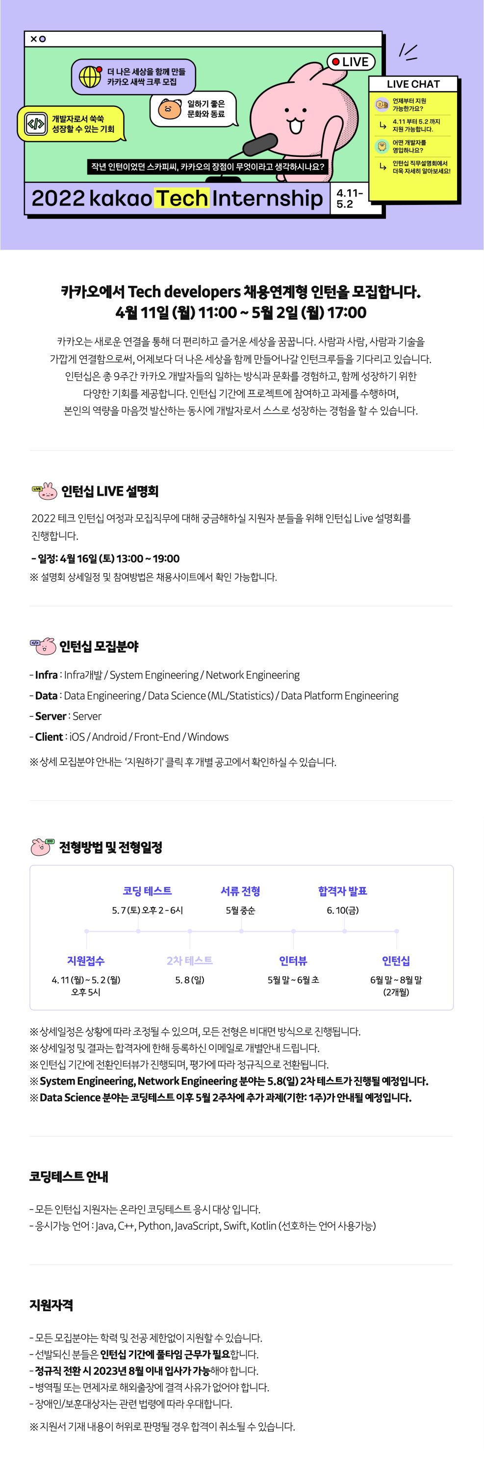 | 제목 | [설명회] 카카오 2022 채용연계형 테크 인턴십 채용공고/LIVE설명회 | 날짜 | 2022-04-14 | 조회수 | 983 |