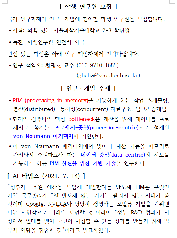 | 제목 | 학생 연구원(국가 연구과제) 모집 - 차광호 교수님 | 날짜 | 2022-07-08 | 조회수 | 1179 |