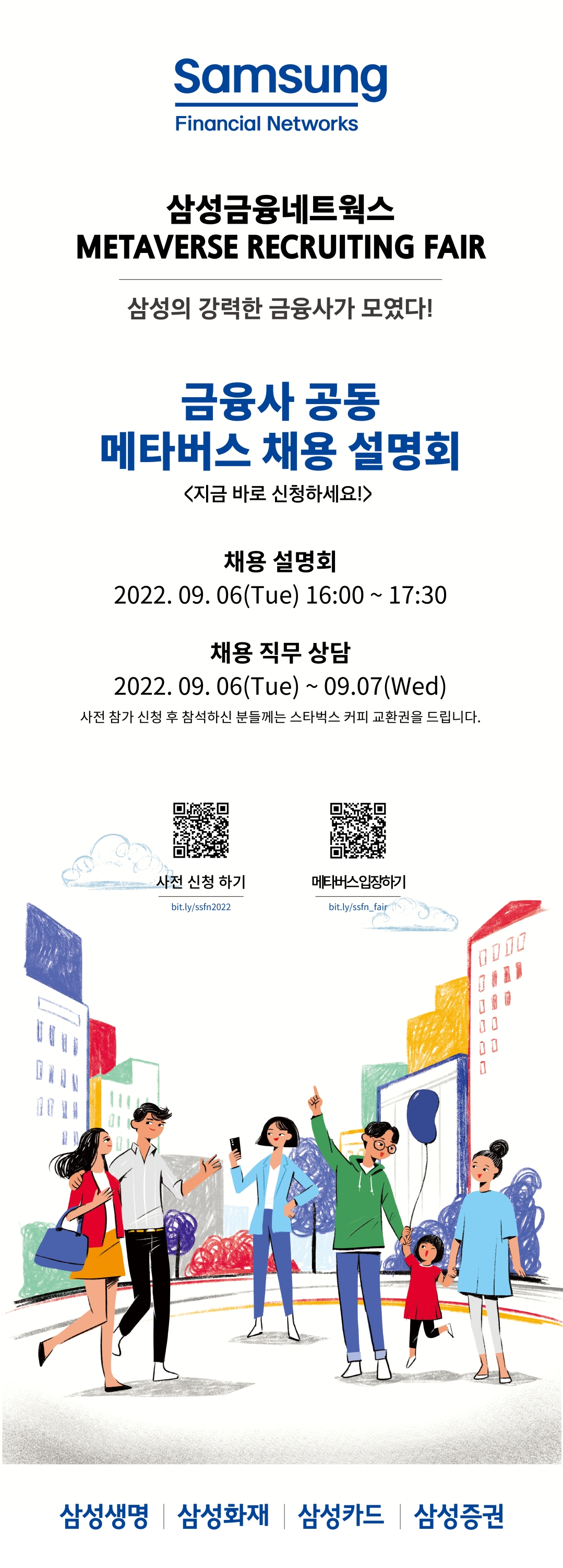 **채용 설명회 : 2022. 9. 6(Tue) 16:00 ~ 17:30 **채용 직무 상담 : 2022. 9. 6(Tue) ~ 9.7(Wed) (사전 참가 신청 후 참석하신 분들께는 스타벅스 커피 교환권을 드립니다.)