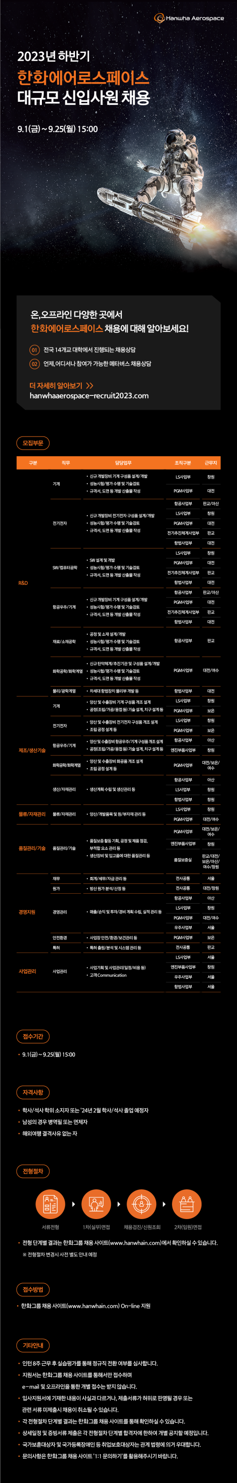 | 제목 | [채용] 한화에어로스페이스 2023년 하반기 신입사원 채용 | 날짜 | 2023-09-05 | 조회수 | 616 |