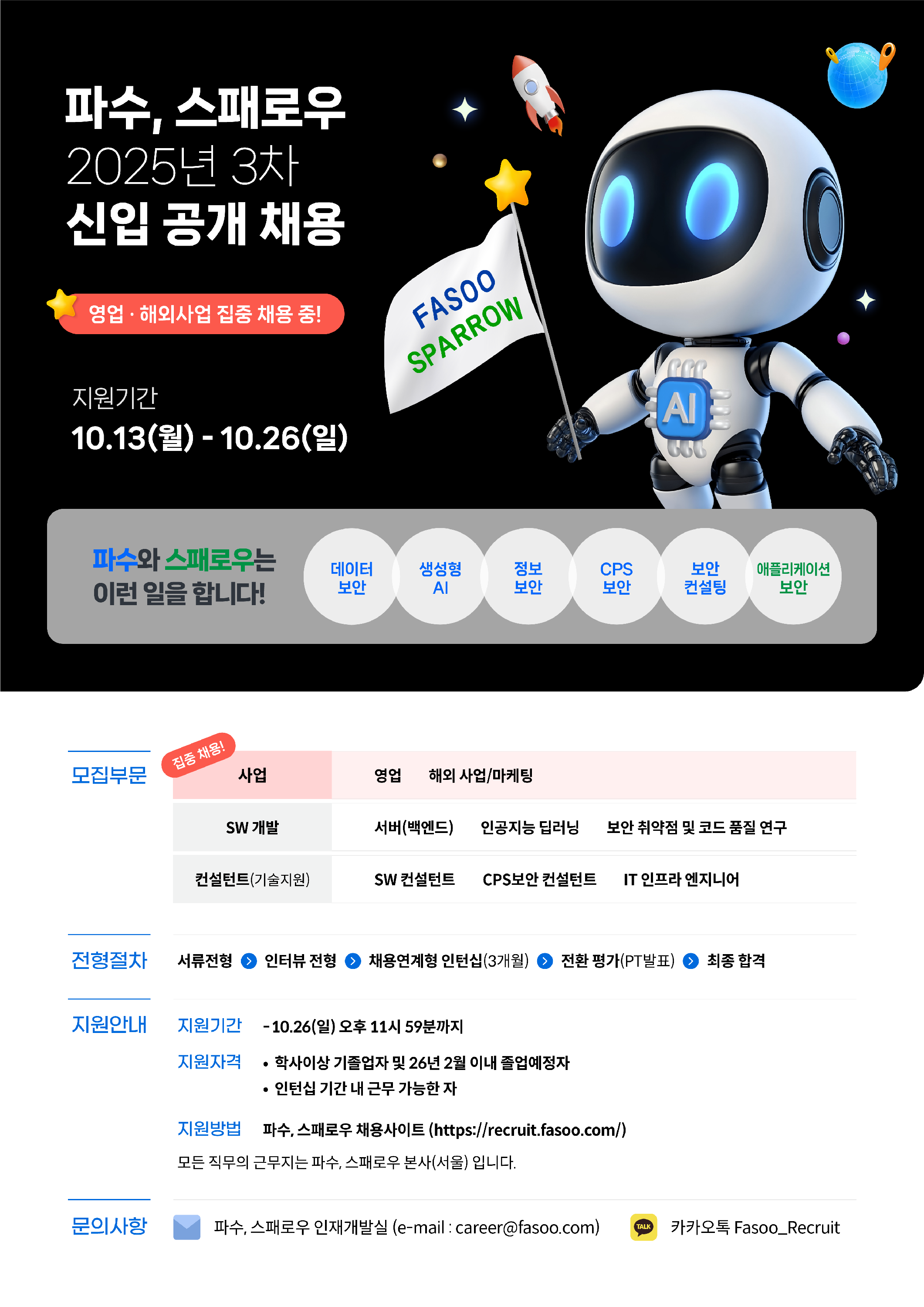 | 제목 | [채용] 파수, 스패로우 2025년 3차 신입 공개 채용(~10/26) | ||||||||||||||||||||