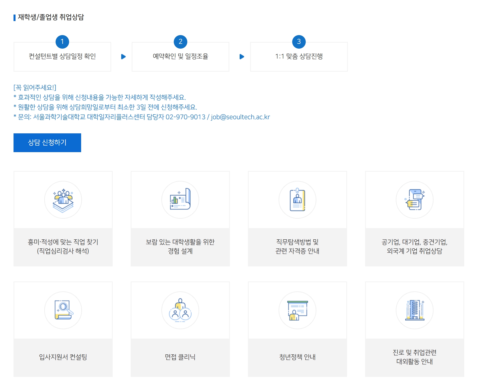 1. 취업진로본부(대학일자리플러스센터) 상담 ☞ https://job.seoultech.ac.kr/consulting/students/ - 문의사항: 02-970-9013, job@seoultech.ac.kr ![]() 2. ST커리어멘토링