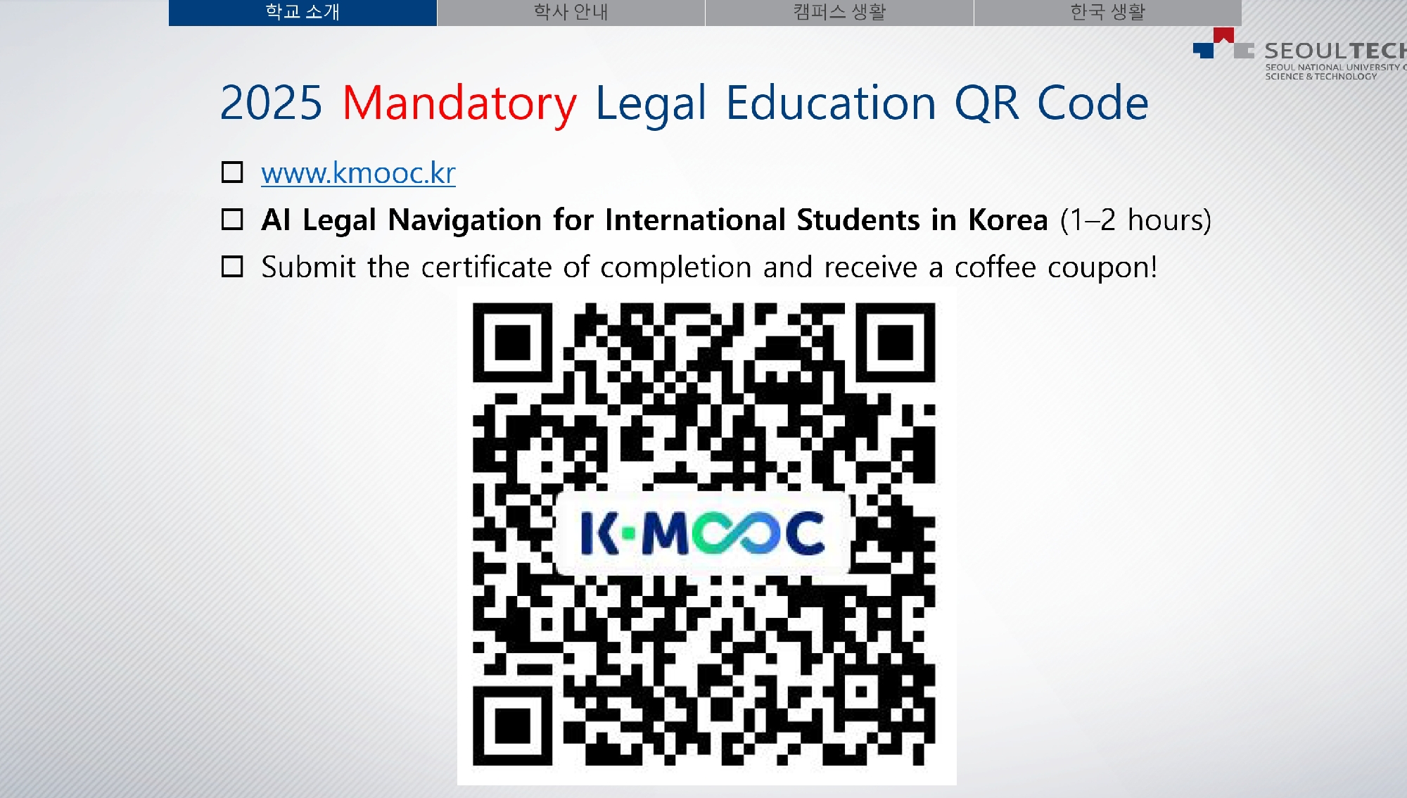가. 필수이수대상자 : 2025. 2학기 신입생 학부 140명, 대학원 77명 ( 외국인 유학생(재학생)도 수강 가능) 나. 필수교육 강좌 : [붙임2 : QR코드] www.kmooc.kr - (강좌명)외국인유학생을 위한 한국생활법률 AI내비게이션 요약강좌 다. 이수절차 : QR코드 접속(모바일/PC가능) → 회원가입(일반회원) → 해당 강좌 수강신청 → 강의실 입장 → 강좌 수강(13주차, 2시간소요) → 이수증 발급 라. 이수기한 : 2025. 10. 17. (금)까지 마. 이수증 제출방법 : 국제교류처(국제관 115호) 직접 방문 또는 이메일(oia@seoultech******) 제출 바. 행정사항 : (학생) 교육 수강 후 이수증 제출완료시 커피 쿠폰 증정