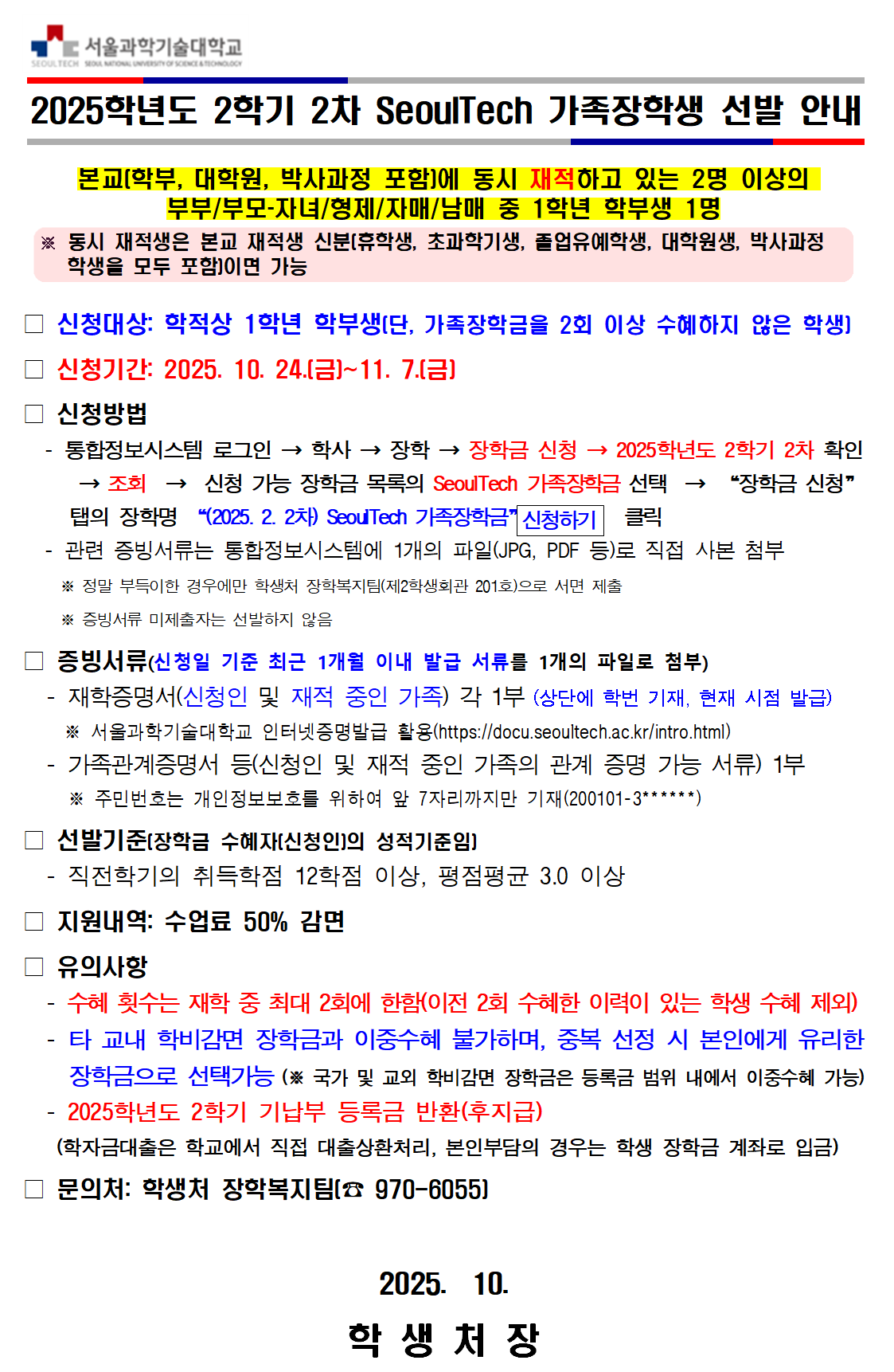 | 제목 | 2025학년도 2학기 2차 SeoulTech 가족장학생 선발 안내 | ||||