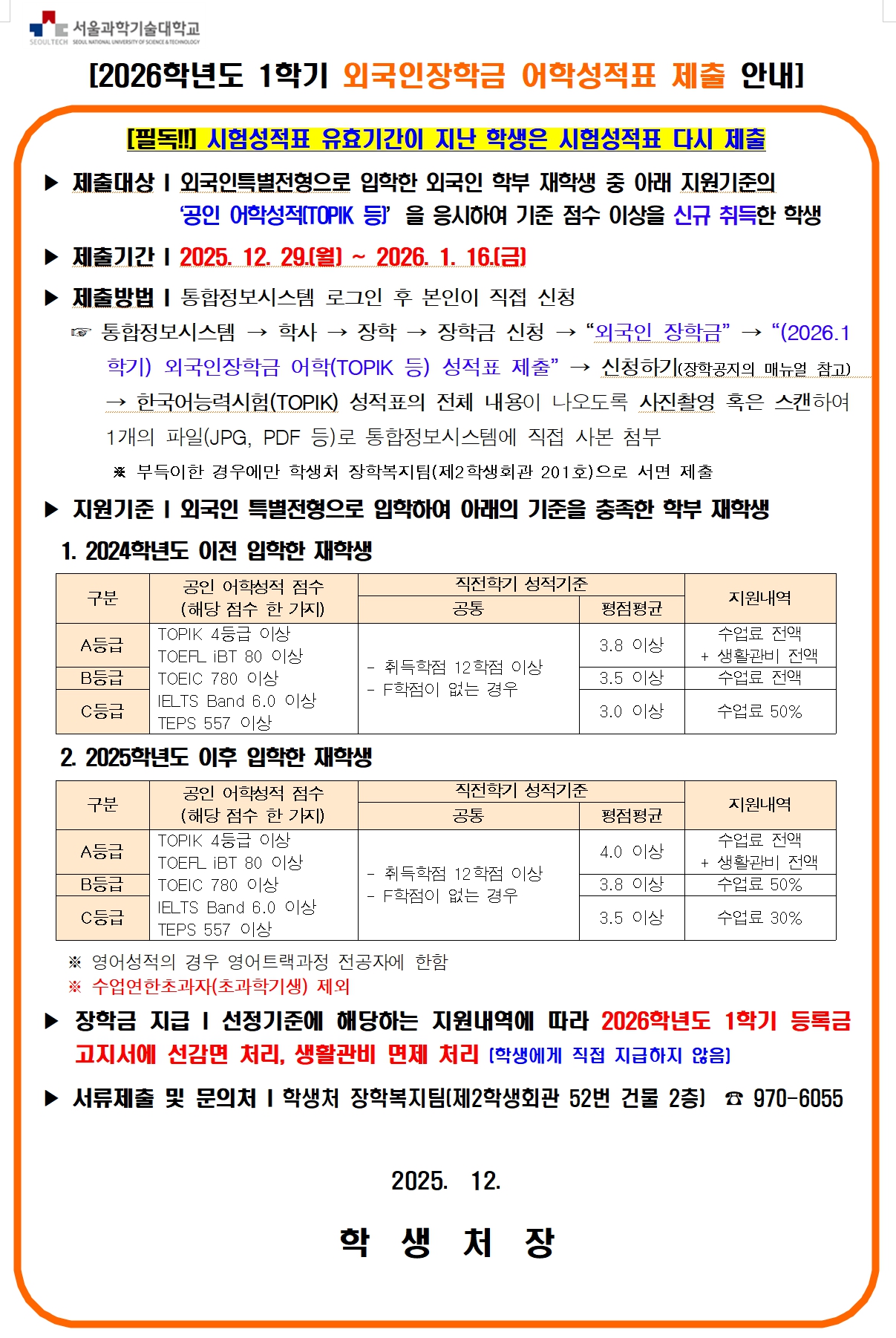 | 제목 | 26학년도 1학기 외국인장학생(재학생) 어학성적 제출 안내 | ||||