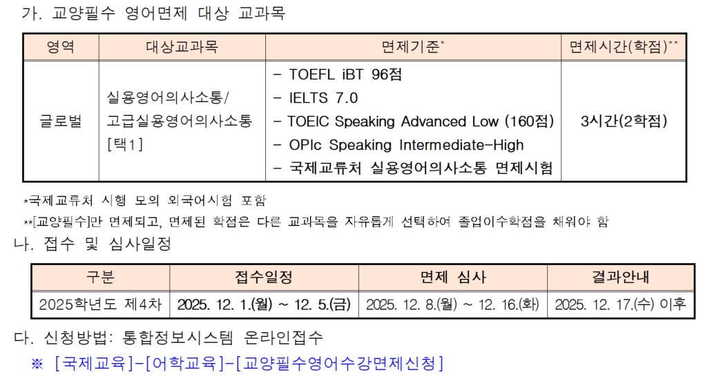 2025학년도 제4차 교양필수 영어 교과목 면제 접수 안내 ![]() |