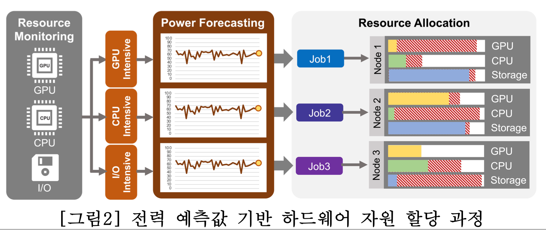 세부 목표는 다음과 같습니다. 1. HPC 하드웨어 특화 모니터링 도구를 활용하여 응용의 자원 사용률 모니터링 및 분석을 통한 인공지능 기반 전 력 예측 모델링 프레임워크 구현 2. 전력 사용량 예측 모델을 활용하여 예측된 전력 사용량에 따른 최적화된 하드웨어 자원 할당